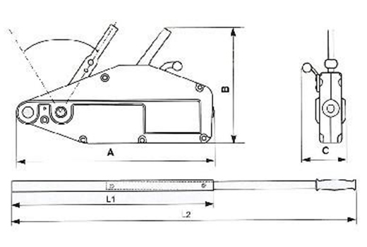 額定起重量(KG) | 額定收拉力N | 額定前進行程 | 鋼絲繩直徑(mm) | 鋼絲繩安全系數(shù) | 整機安全系數(shù) | 最大載荷(KG) | 整機重量(KG) | 整機尺寸 | L1(mm) | L2(mm) | ||||||