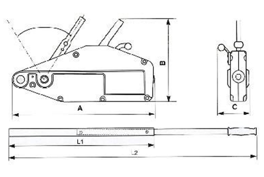 型號 額定載荷 額定載荷時手拉力 額定載荷時手柄往復一次鋼絲繩行程 鋼絲繩直徑 葫蘆重量 外形尺寸